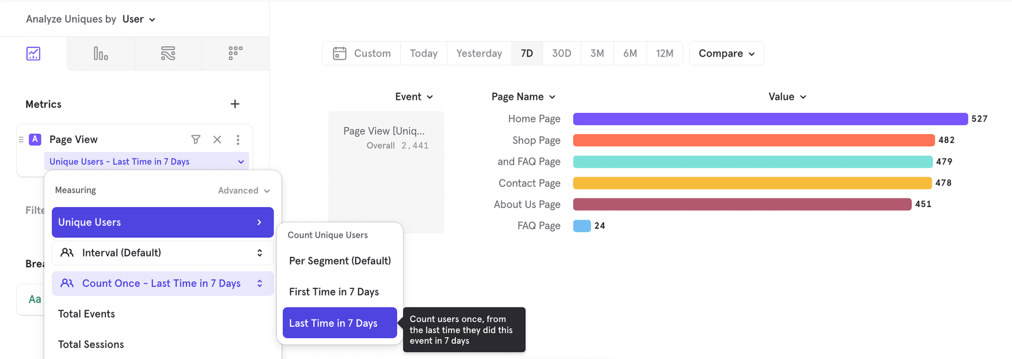 There are some cases though, where you want to know how the 2441 users are distributed, generally either by their first or last action. For example, based on the last page (segment) a user saw, tell me the distribution of users. You can enable this now via the advanced control for Uniques, by choosing which segment to associate a user to: either the first segment or the last segment in the chart date range (7D in the below image)